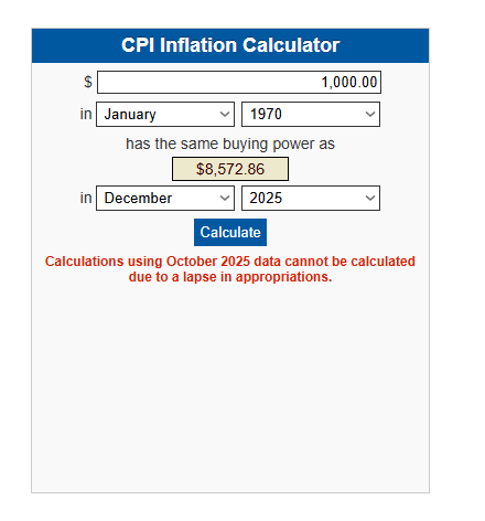 According to BLS data, when we calculate the value of $1000 in January 1970 and its value in December 2025, we see that it is equal to $8,572.86.